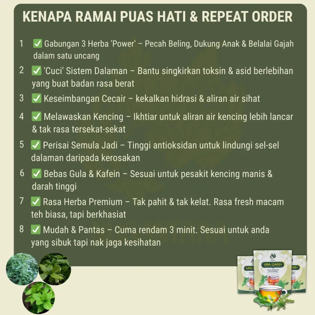 ✅ Ura Care+ ialah teh herba tradisional yang dirumus daripada tumbuhan seperti Pecah Beling, Dukung Anak & Belalai Gajah.